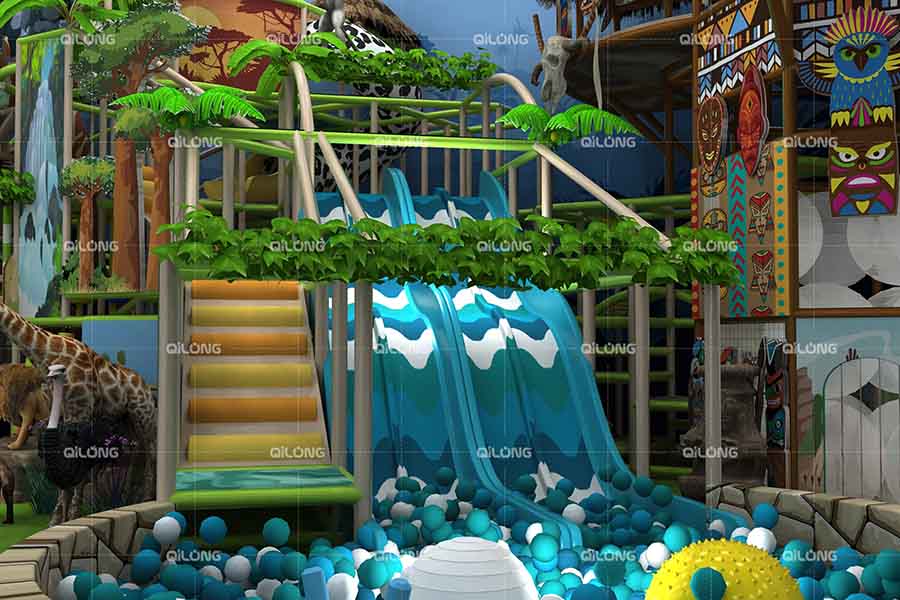 Top view — when kids enter into jungle theme like enter into forest, with river ball pool slide,animals and trampoline